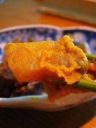賀茂茄子自体に水分が多量に含まれているため、揚げの火の通しはじっくりする必要がある。ただしいったん火の通った身肉は、サクリという茄子特有の食感が残りつつも、トロッとした田楽の舌触りが非常に心地よい!