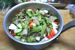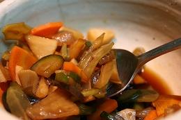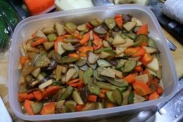 彼によると「とにかく7種の野菜を使うんですよね」ということだったが、まあ7種じゃなくてもいいかぁ、ということで集めやすいものにしてしまう。大根、ニンジン、キュウリ、ナス、ナタ豆をメインに、ショウガを香り付けに少し使う。メインの野菜類はイチョウ切りに刻み、塩を振って浅漬けにしておく。本当はレンコンがあったらよかったなぁ。