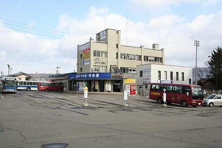 駅のロータリーの向こうに、バスの発券所&待合い施設がある。そこに飲食店が入っているのか?