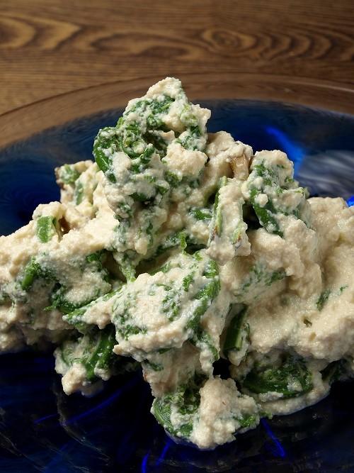 少し甘めに仕上げた白和え衣は、湯通しして締めた木綿豆腐を馬の毛の裏漉し機で滑らかに仕上げたものだ。大豆タンパクの滑らかな口当たりがコゴミの食感を引き立たせ、そしてコゴミが持たない旨みと甘さで芳醇さがプラスされる。