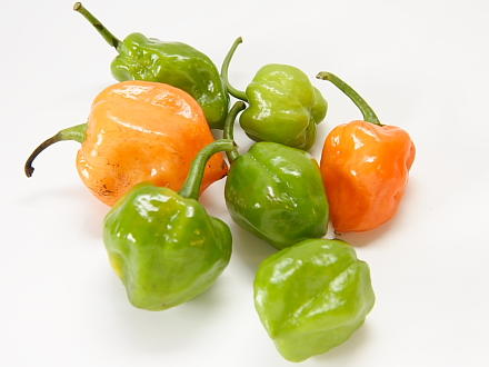 最近、暴君ハバネロなどのスナック菓子でも有名になったハバネロ。世界で最も辛い唐辛子の部類である。アメ横のスパイス屋さんである大津屋商店で、まだ市販前のハバネロパウダーを分けてもらったことがあるが、そこには「取り扱い注意 目にはいると失明するおそれがあります」と書いてあり、戦慄したことを思い出す。これはオレンジ色の品種。辛味は赤と同等だ。