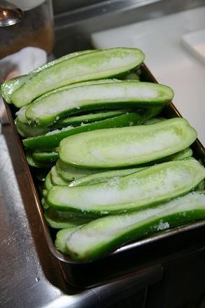 奈良漬けには白瓜という作物を使う。青瓜というのもあるのだが食感がざくざくしすぎていて、あまり美味しくないといわれている。白瓜は緻密な果肉で、色も上品に仕上がるのだ。しかし、本来であれば8月中旬くらいで白瓜のメイン産地は終了。いつもながら後手後手になってしまう僕の癖が出て、今年も調達には苦労した。山梨県産のものがかろうじて入手できたので、一箱18本入れのものを使う。サイズがMで小さいのだが、まあいいだろう。