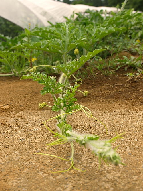 西瓜は瓜なので、このように蔓(つる)を四方八方に伸ばしながら結実する。カボチャと西瓜は、十分に畝(うね)間と株間のスペースをとらないとうまく生ってくれない。日射量が命なので、日光を受けるための葉が他の株と重ならず十分に展開できることが肝要なのである。