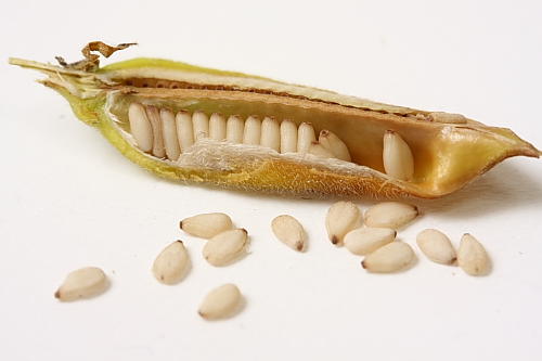 この写真はマクロレンズで思い切り寄って撮影しているのでスケール感を感じないかも知れないけど、あまりに小さい莢(さや)の中に、ゴマの種子が一直線にビッシリと並んでいるわけだ。さきほど横から観たときに4つの房に分かれていたが、その一つの房の両側に一列ずつ、ゴマが並んでいる。従って小さな一つの莢ではあるが、かなりの量のゴマが内在しているのだ。
