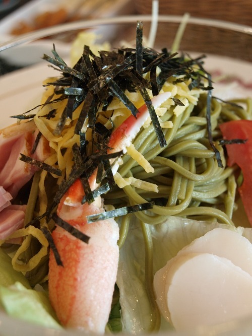 見ての通りの茶そば に様々な魚介とハム、野菜が盛られていて、これにゴマベースのドレッシングというかつゆをかけていただく。これが侮れないほどに美味い!