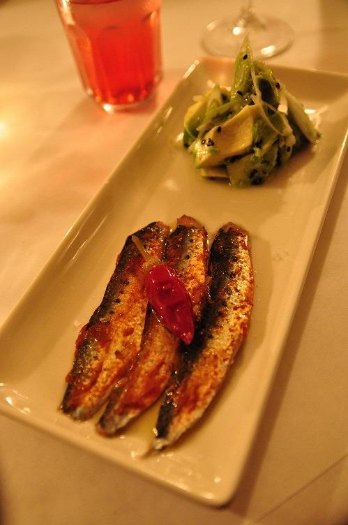 チリを効かせたイワシとアボカドサラダ。コンフィにされたチリを潰してまぶしながらイワシを食べると、びりびりと辛みが来るのがよかった。