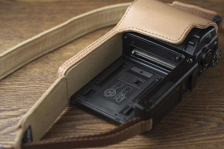 そう、純正の本革製ソフトケースだ。これ、二つの部分から成り立っていて、基本的にはカメラボディの底部にある三脚穴にネジを入れて装着する、ストラップ付きのケース↓と、