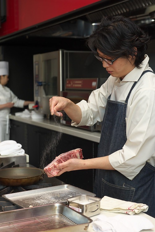 「こちらは、なんといってもサシの美味しさ、風味を必要とするので、脂をこうやって戻してあげます。」