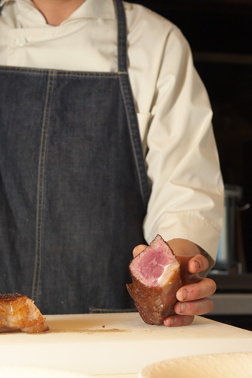 「寝かせて火入れをするのは、予約中心のコースメニューとかでなら可能ですが、飛び込み客がいたりアラカルト中心の店では難しいですよね。冷蔵庫から出したばかりの、室温になっていない肉を使わなければならない状況下で、どのように熟成肉を焼いていくか、うちなりの方法をお見せします」