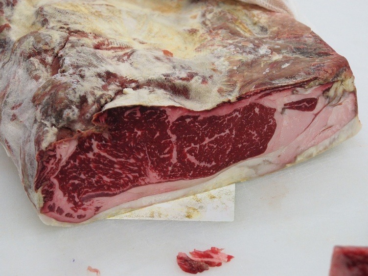 ついているものの、肉の水分が多く、香りとうま味の凝縮がうまくできていません。また、菌が繁殖しやすい自由水が肉の内部に残っているため、これ以上置いておくと腐敗する可能性のある、特徴的な臭いも感じられました。メール添付した各写真をご覧下さい。●●さんの冷蔵庫で熟成したものは、カビ