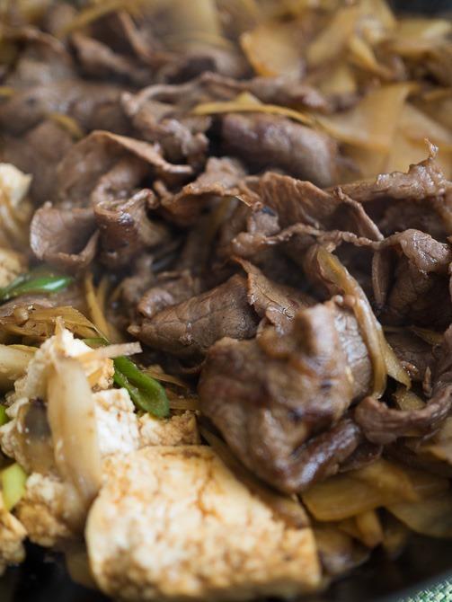ちなみに僕は、汁の多いすき焼き鍋に肉をいれて「茹でた」すき焼きが好きじゃないので、あらかじめすき焼き鍋に入れる肉を片面だけ焼き付けて、焼き色をつけて脂を落とします。焼いた肉は取り置いて、出た脂と肉の切れ端をおいたまま野菜を焼いて、砂糖と酒と醤油を入れて、そこに肉を戻していく方式。