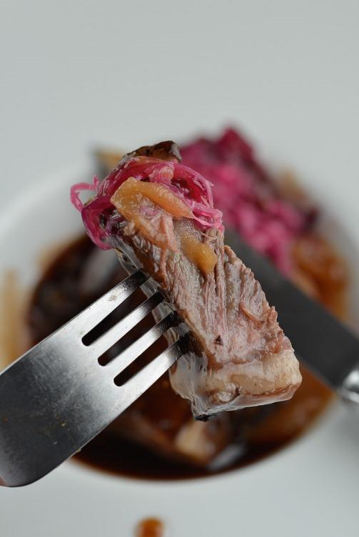 肉は煮込んだとは思えないほどにシットリしているのだ!ぜんぜんバサッとしていない。全体に水分がちゃんとのこり、うま味がすべて閉じ込められている。そして、赤キャベツの酸味とシナモンをしのばせたリンゴのピュレがモスタルダのイメージ(by小池君)でまた変化を出す。黒酢のソースは酢豚を想起させる甘からすっぱで、こんな肉のかたまりなのに食欲が増進してしかたがない!