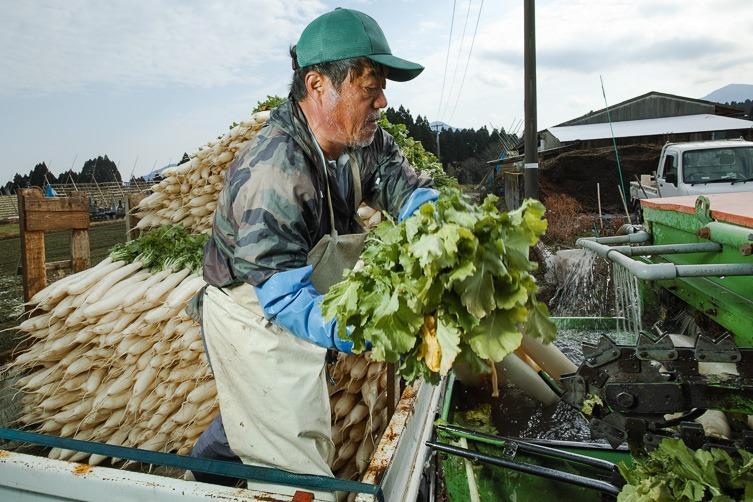 とにかく黙々と大根を運ぶおさむちゃんの動きがかっこよくて、どうしてもこれに肉薄した写真を撮りたくて、持ち運んでいた機材からスタンドとフラッシュを出して、日中シンクロを仕掛けて、洗浄機の下に潜り込んでシャッターを切りまくった。