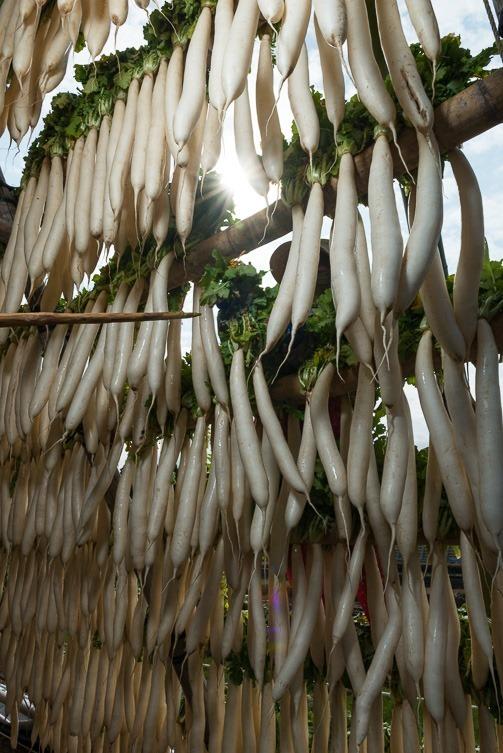 こうして、やぐらが大根を満載したやぐらが仕上がったわけだ。生の大根は、10日から2週間ほどかけて、つよい寒風と天日によって干される。その間は、雨に濡れたり、氷点下で凍ったりしないように調整が必要だ。雨の予報が出たらブルーシートを全体にかぶせる。氷点下に気温が下がる予報が出たら、中でストーブを焚いて、温度を上げる。この間、干し大根農家は気が抜けないのだ。