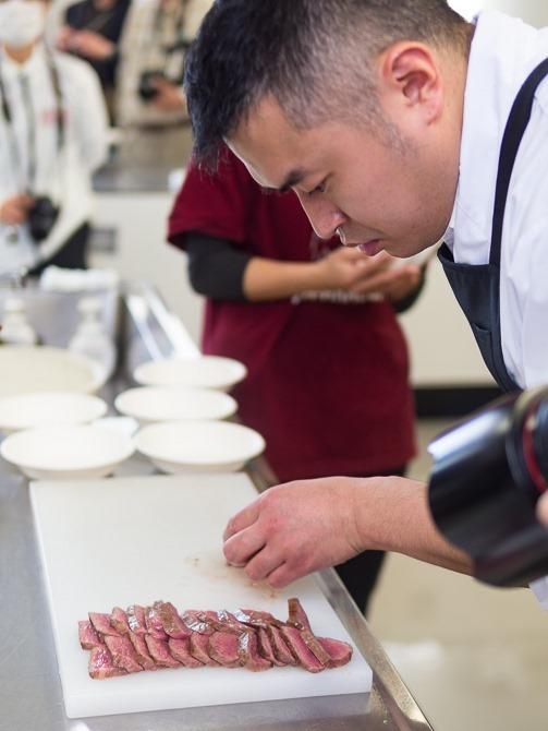 さて日本料理チーム、まずは土佐あかうしのサーロインの炭火焼き・高知の柑橘で作ったちり酢ジュレのせにかかります。