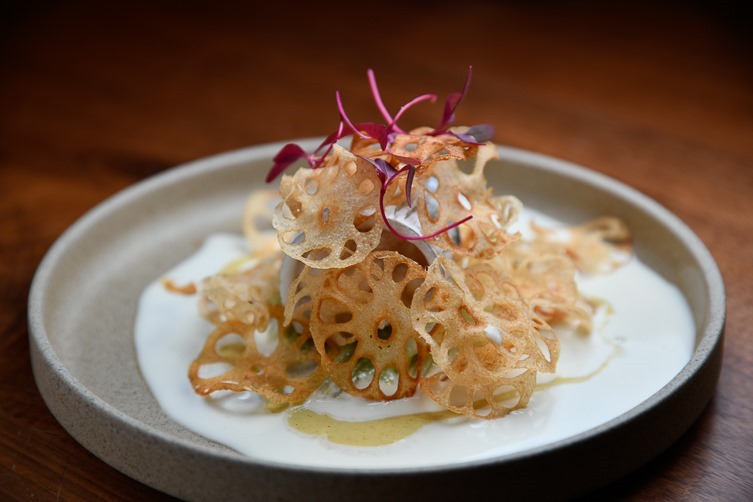 ワタリガニの肉と、白いのは豆腐ソース。黄色いオイルはオリーブではなく御なたね油!なんでもオリーブが合うとは限らない!