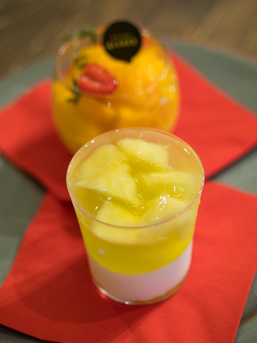手前は宮崎県西都市のマンゴーを贅沢に使ったマンゴープリン、奥は静岡はクラウンメロン部会のアールスメロンをふんだんに盛り込んだパンナコッタ。