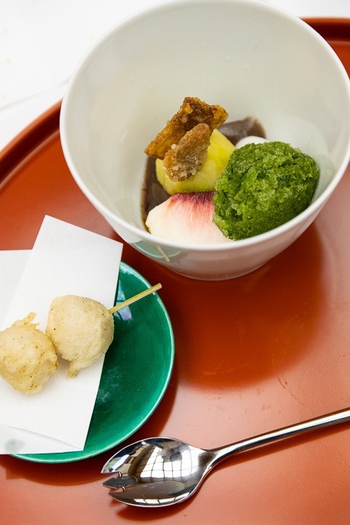 お椀は瓢亭・高橋義弘君によるもの、いつものマグロ節に鱧しんじょう、しんじょの中にさいの目の賀茂茄子が。