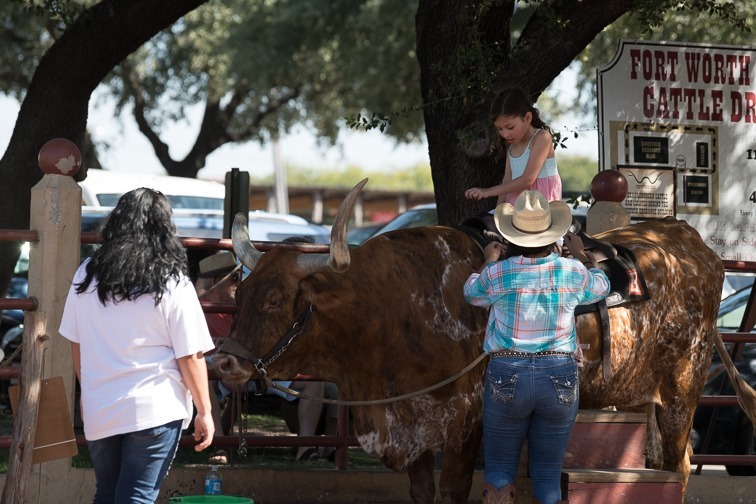 会場近くには、5ドルで背中に乗れるロングホーン牛がいる。大人しい性質だとは聞いていたけど、本当に大人しい。