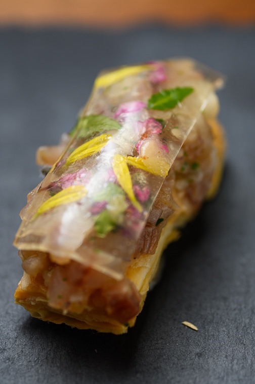 黒酢などのソースをゼリーに固めたシートをのせた美しい仕立て。
