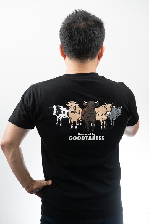 もちろん背面は弊社が関わってきた牛品種たち(みなさんどれがどれだかわかりますか?)。そしてその下には燦然と輝く”Powered by GOODTABLES”マークが!