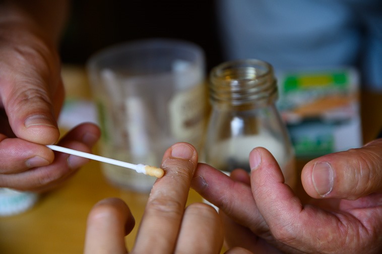 薬指の中腹に二箇所、赤く血が出ているところがおわかりだろうか。ここに血を吸い出す逆注射器みたいなので吸い出したのち、、、特別な油を塗る!