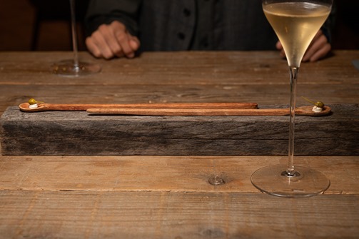 これが、さきほどの畑にあった黒大豆の枝豆。茹でた枝豆に黒胡椒とフェンネルシード、粒状の塩が合わせられている。シンプルだが複雑な香りになって、塩で食べる枝豆と違ってハッとする味わいだ。