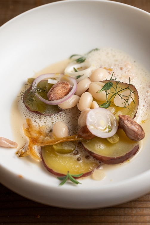 この一皿もねえ、よくみたら全部、でん粉です。芋、豆、豆ですからね。鈍重になるでしょう、と思いきや、それぞれの個性が生きて鈍重にならない。不思議です。細かく細かく、ハーブや種子スパイスを用いているから、極小の変化が料理に出ているんだろう。