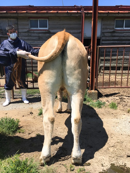 この趣旨に賛同してくれた畜産試験場のスタッフ、主には尾石さんと秋澤君におんぶにだっこなのですが、彼らが要所要所で診てくれており、いまのところ順調に育っています。もちろん肉牛の肥育をしている人ならみておわかりの通り、肥育牛か!?と驚くほどすっきり痩せたお尻なのですが(笑)