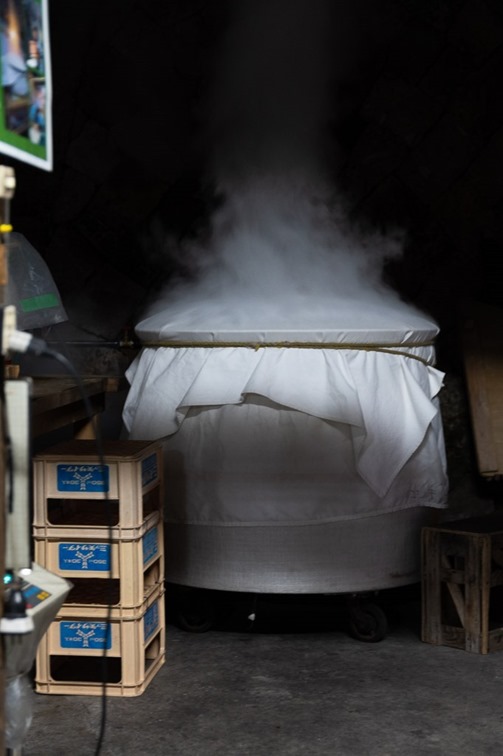 麹室を出ると、のちほど麹に仕込む米を蒸していて、甑(こしき)から盛大に湯気が上がっていた。