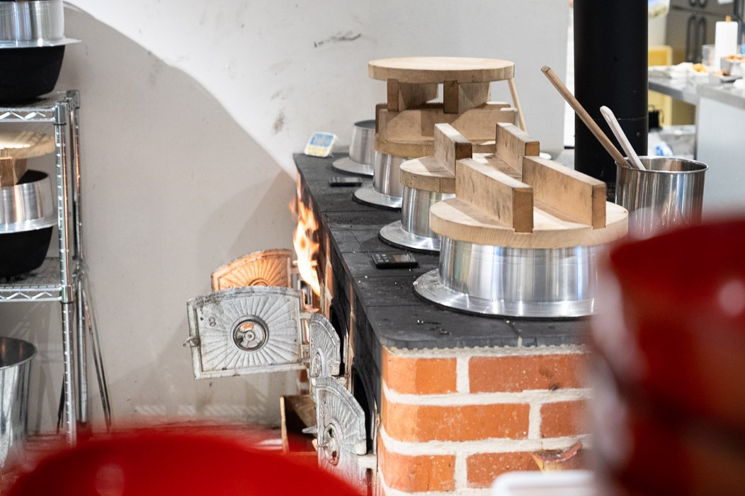 調理場内になんと、ごはんを炊くかまどが並ぶ、いわゆる「おくどさん」がドンドンドンドンと4台!!