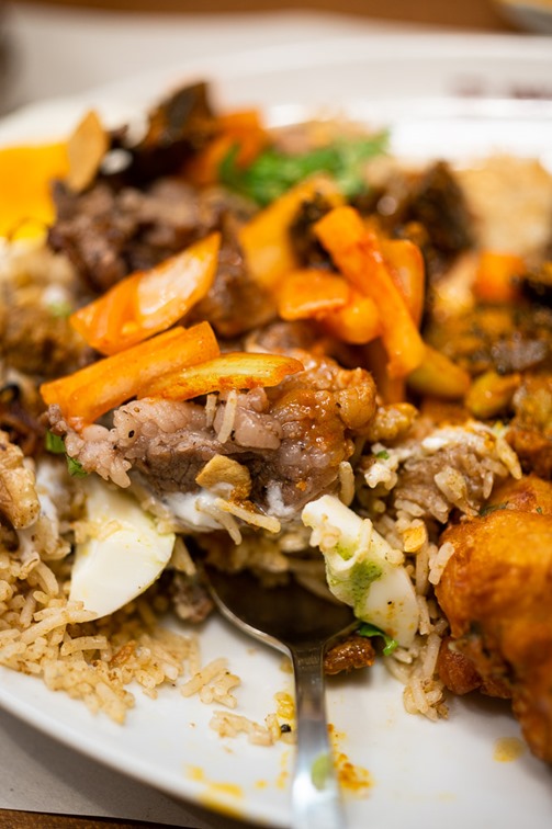 そして、すべてが一つの皿に盛られた、パキスタンの食堂風ってこれだなという最高の一皿が運ばれてきた! ていうか、かなりのボリュームですよ、かなりの。海老と玉ねぎ、パクチーのパコラがデカい! またビーフビリヤニにのっているガーリックカルビもたっぷりだ。 ドンキホーテの圧縮陳列をデリーでやったらこうなるな的な!