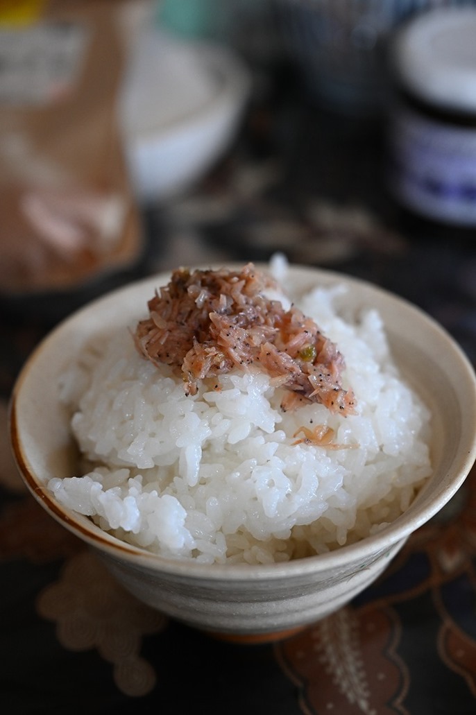 中でも僕が気に入っちゃったナンバーワンがこれ、小さい小さい海老?プランクトン?のアミの塩辛に柚子ごしょうをまぜたの。塩っぱくて海老の風味が旨くて、柚子ごしょうのビリ辛感と相まって、これだけでメシが進む!