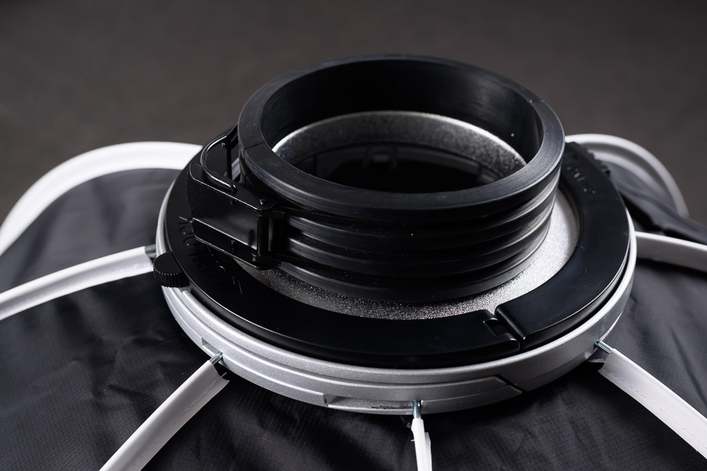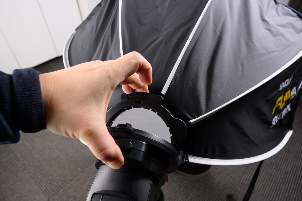 なかなかに丁寧な作りです。なお、アウターディフューザーは固定されている。この状態で、プロフォトのストロボに装着するわけだ。