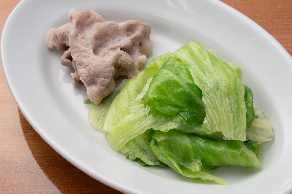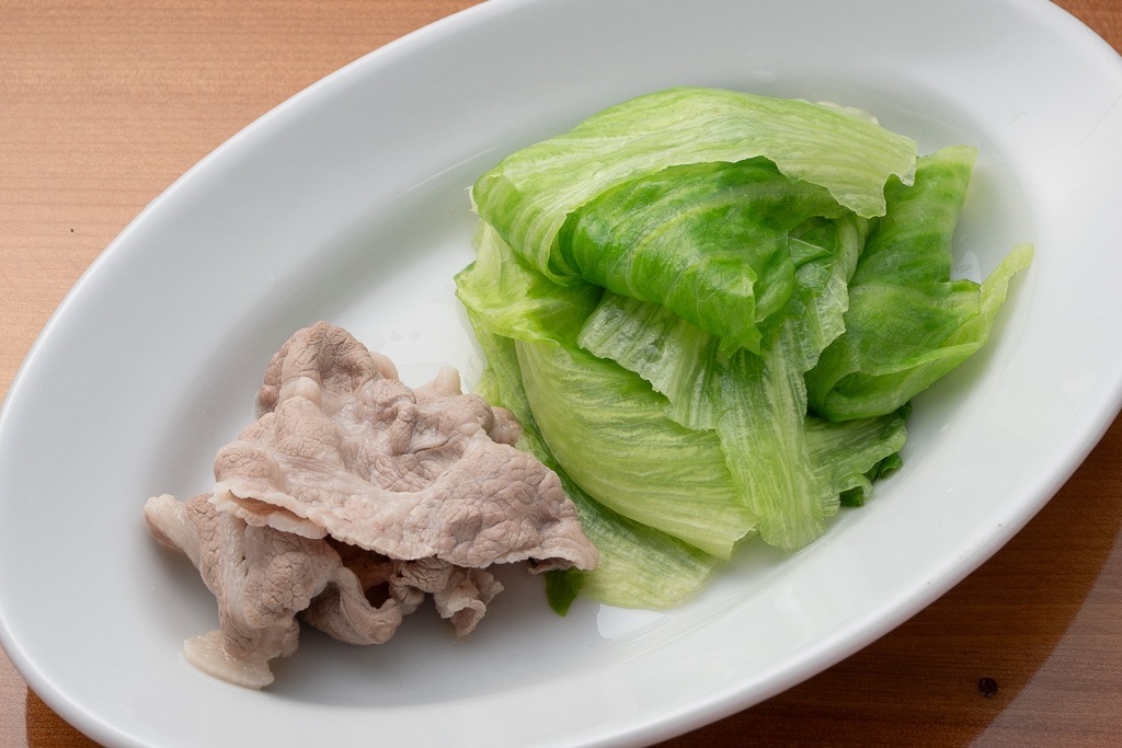 豚肉を、しゃぶしゃぶしたレタスで巻き込んで、八木澤商店の絶品ポン酢でいただく。湯に通しても失われないレタスのシャキ感と清涼感あふれる香りにポン酢の酸味がマッチして、箸が止まらず際限なく食べてしまう!
