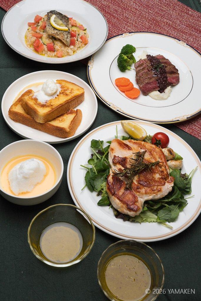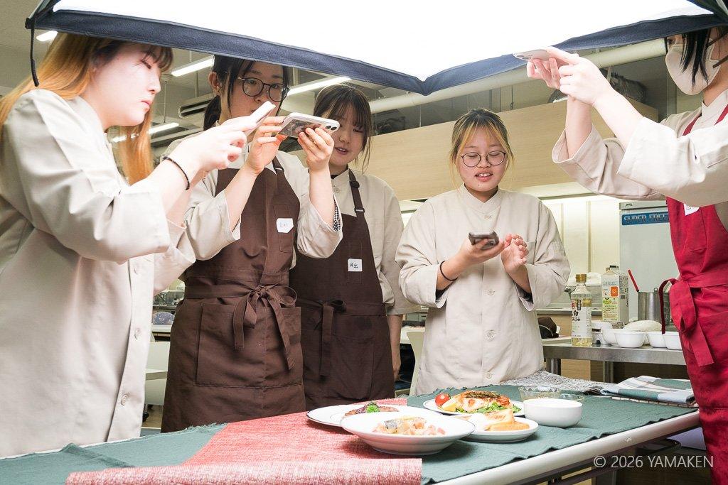 この料理、学生が4班に分かれ、自分達で企画して作ったものです。「おいしさの科学」「フードテック論」を担当してもらっている樋口くんが僕の研究室に駆け込んできて「やまけんさん、カメラ持って来て下さい! ちょっとスゴいことになってるから、、、」というので、押っ取り刀で駆けつけたときのもの。急ぎ、LEDにソフトボックスを着けて単純なトップライトで撮影したので、ちょっとライティングが今ひとつなんだけど。