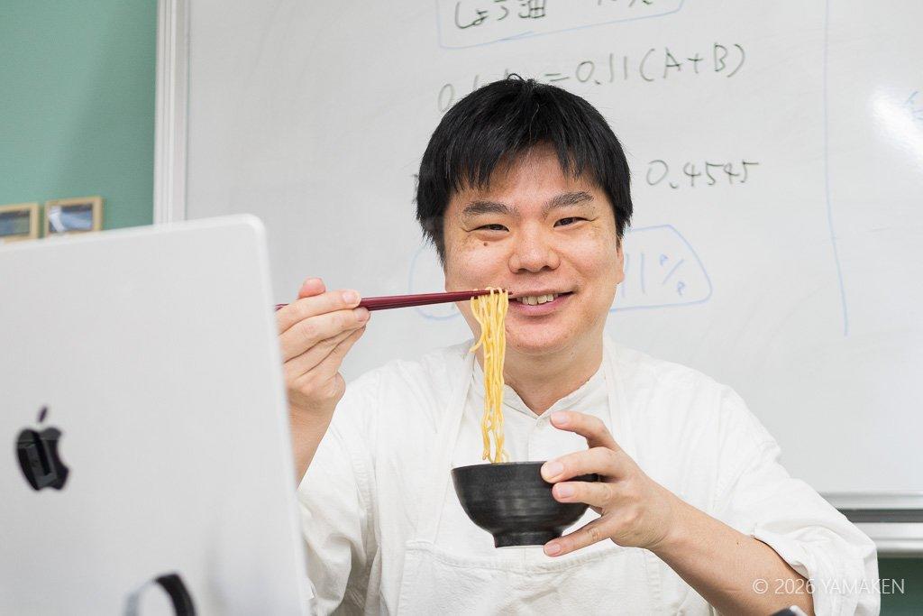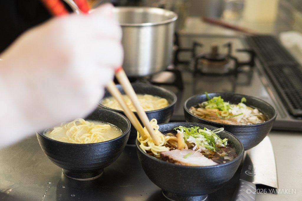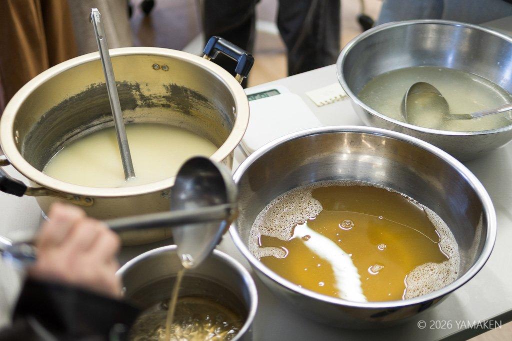 樋口先生が醤油ダレ、塩ダレ、鶏ガラスープ、鶏白湯スープ、魚介系スープ、市販の太さの違う中華麺などをいろいろ用意して、どの組み合わせをどのように合うのかを自分の舌で確認する。