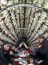 雨の大根やぐらもまたよし。福岡から宮崎に移動して、干し大根の下で宴会を張った!